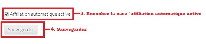Une fois dans les options, il vous faudra encocher l’option « Affiliation automatique active » en bas de page et cliquer sur le bouton « sauvegarder ».